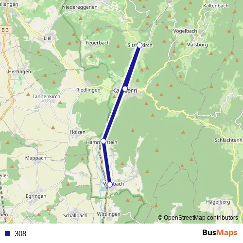 The first stop of the 308 bus route is Kandern, alte Schule and the last stop is Wollbach (Kr LÖ), Schule. 308 is operational during an Werktagen.