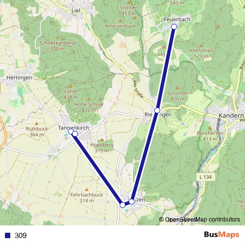 The first stop of the 309 bus route is Feuerbach and the last stop is Tannenkirch Schule. 309 is operational during an Werktagen.