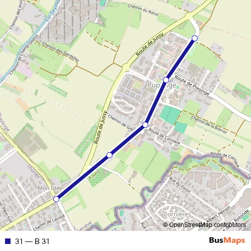 The first stop of the 31 bus route is Thônex, Mon-Idée and the last stop is Puplinge, Pré-Marquis. 31 (B 31) is operational during an Werktagen.