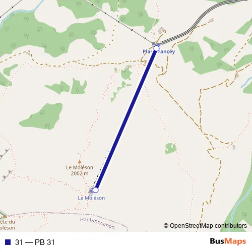 The first stop of the 31 cable-car route is Plan-Francey (téléphérique) and the last stop is Le Moléson. 31 (PB 31) is operational during täglich.