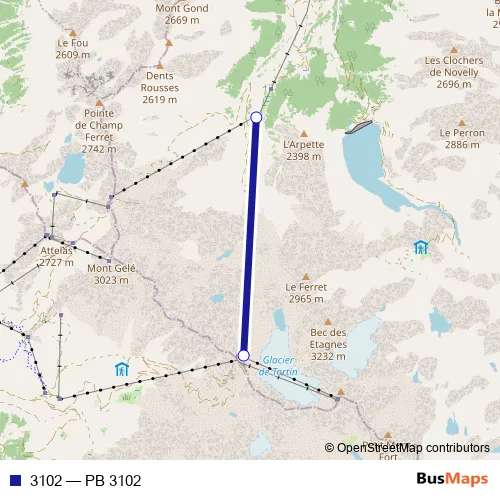 The first stop of the 3102 cable-car route is Col-des-Gentianes and the last stop is Tortin (Col-des-Gentianes). 3102 (PB 3102) is operational during täglich.