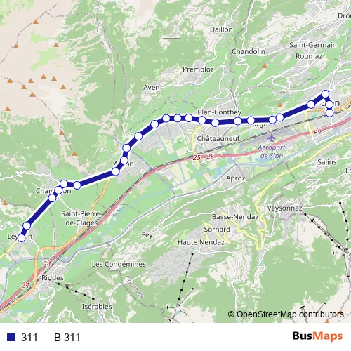 The first stop of the 311 bus route is Leytron, anc. poste and the last stop is Sion, poste/gare. 311 (B 311) is operational during an Werktagen.