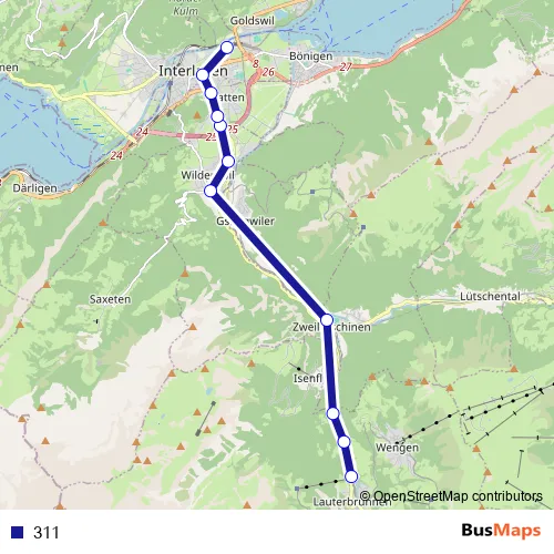 The first stop of the 311 bus route is Lauterbrunnen, Bahnhof and the last stop is Interlaken Ost, Bahnhof. 311 is operational during täglich.