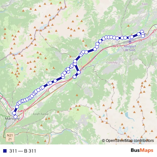 The first stop of the 311 bus route is Martigny, gare and the last stop is Sion, poste/gare. 311 (B 311) is operational during täglich.