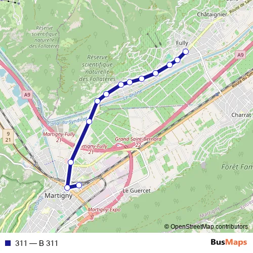 The first stop of the 311 bus route is Fully, poste and the last stop is Martigny, gare. 311 (B 311) is operational during an Werktagen.