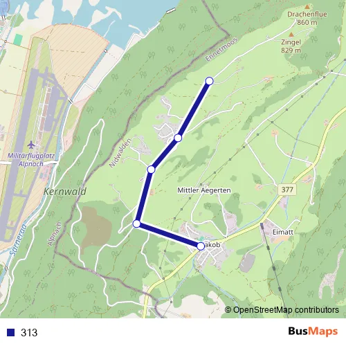 The first stop of the 313 bus route is St. Jakob (Ennetmoos) and the last stop is Ennetmoos, Mueterschwandenberg. 313 is operational during an Werktagen.
