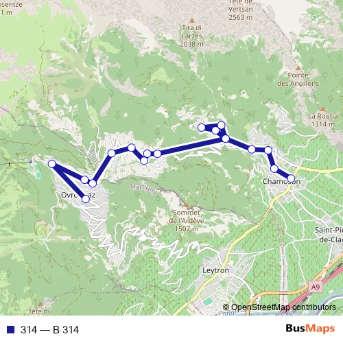 The first stop of the 314 bus route is Chamoson, église and the last stop is Ovronnaz, Centre therm. Melley. 314 (B 314) is operational during an Werktagen.