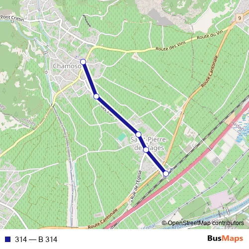 The first stop of the 314 bus route is Chamoson-St-Pierre-de-C., gare and the last stop is Chamoson, église. 314 (B 314) is operational during täglich.