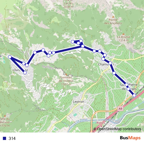 The first stop of the 314 bus route is Chamoson-St-Pierre-de-C., gare and the last stop is Ovronnaz, Centre therm. Melley. 314 is operational during täglich.