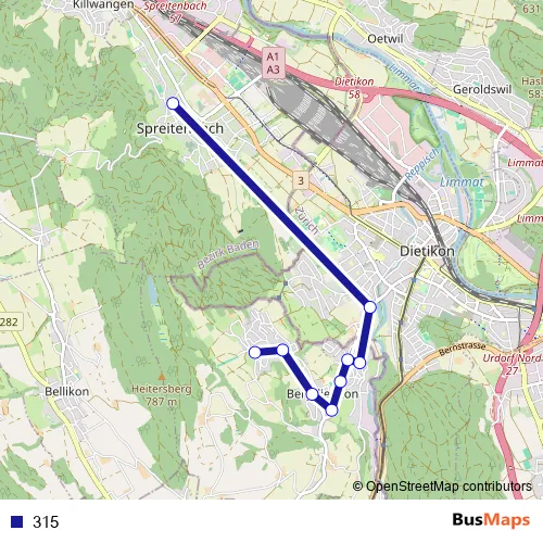 The first stop of the 315 bus route is Spreitenbach, Glattler and the last stop is Kindhausen Ag. 315 is operational during an Werktagen.