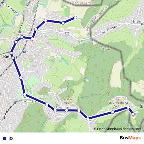 The first stop of the 32 bus route is Bettingen, Chrischonaklinik and the last stop is Riehen, Rotengraben. 32 is operational during täglich.