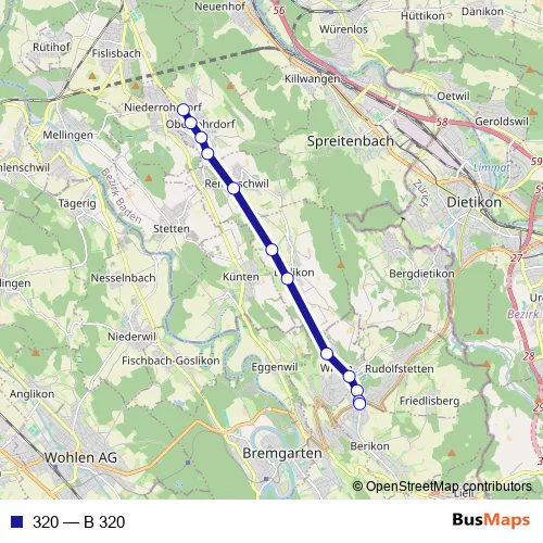 The first stop of the 320 bus route is Oberrohrdorf, Staretschwil and the last stop is Berikon-Widen, Bahnhof. 320 (B 320) is operational during täglich.