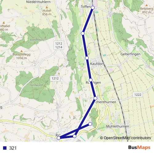 The first stop of the 321 bus route is Riggisberg, Post and the last stop is Toffen, Bahnhof. 321 is operational during täglich.
