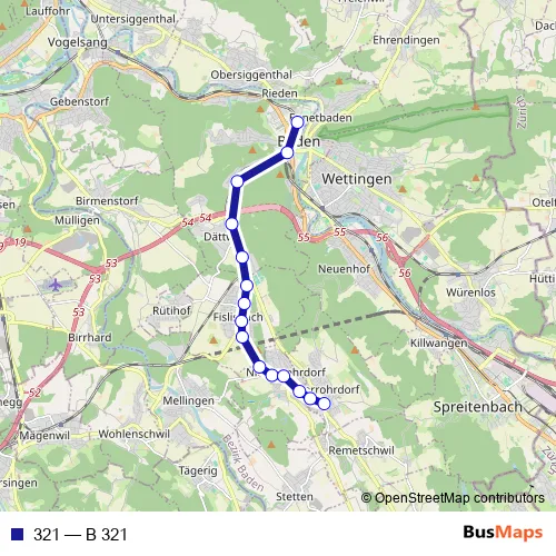 The first stop of the 321 bus route is Baden, Postautostation and the last stop is Oberrohrdorf, Zentrum. 321 (B 321) is operational during an Werktagen.