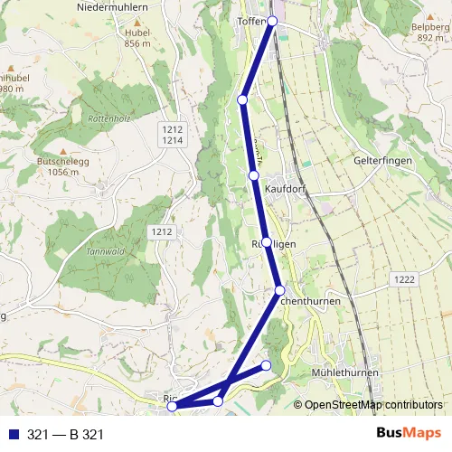 The first stop of the 321 bus route is Riggisberg, Post and the last stop is Toffen, Bahnhof. 321 (B 321) is operational during täglich.