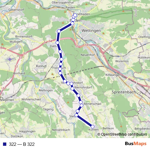 The first stop of the 322 bus route is Künten, Bodenacher/Breiti and the last stop is Baden, Postautostation. 322 (B 322) is operational during an Werktagen.