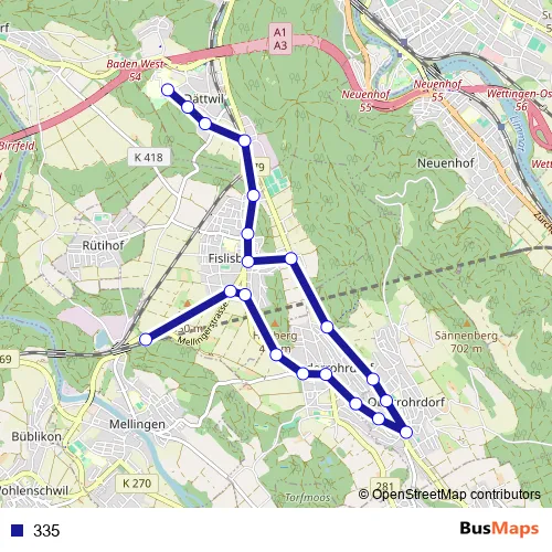 The first stop of the 335 bus route is Baden, Kantonsspital and the last stop is Mellingen Heitersberg, Bahnhof. 335 is operational during täglich.
