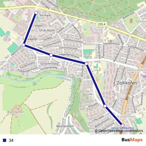The first stop of the 34 bus route is Zollikofen, Hirzenfeld and the last stop is Unterzollikofen, Bahnhof. 34 is operational during täglich.