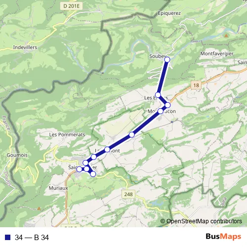 The first stop of the 34 bus route is Saignelégier, gare and the last stop is Soubey, restaurant Relais. 34 (B 34) is operational during am Wochenende.