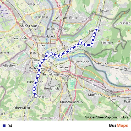 See why over 2 million users trust and consider busmaps.com as the best public transport website. busmaps gives you Basel Buses suggested routes, real-time bus tracker, line route maps in Basel, and helps to find the closest 34 bus stops near you. No internet available? Download an offline PDF map and bus schedule for the 34 bus to take on your trip.