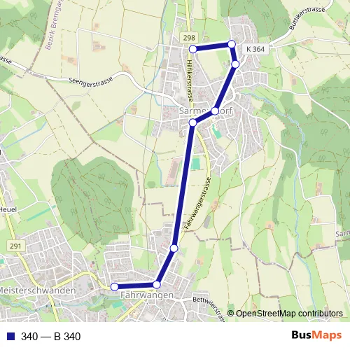 The first stop of the 340 bus route is Fahrwangen, Bahnhof and the last stop is Sarmenstorf, Vorstadt. 340 (B 340) is operational during an Werktagen.