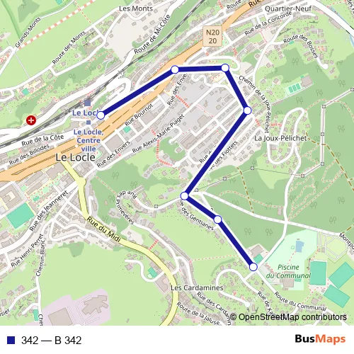 See why over 2 million users trust and consider busmaps.com as the best public transport website. busmaps gives you Le Locle Buses suggested routes, real-time bus tracker, line route maps in Le Locle, and helps to find the closest 342 bus stops near you. No internet available? Download an offline PDF map and bus schedule for the 342 bus to take on your trip.