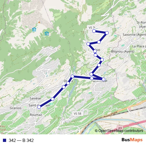 The first stop of the 342 bus route is Arbaz, café du Lac and the last stop is Savièse, St-Germain centre. 342 (B 342) is operational during am Wochenende.