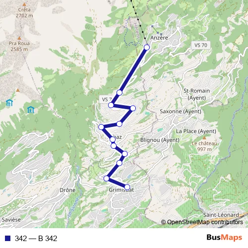 The first stop of the 342 bus route is Anzère, télécabine and the last stop is Grimisuat, Home les Crêtes. 342 (B 342) is operational during täglich.
