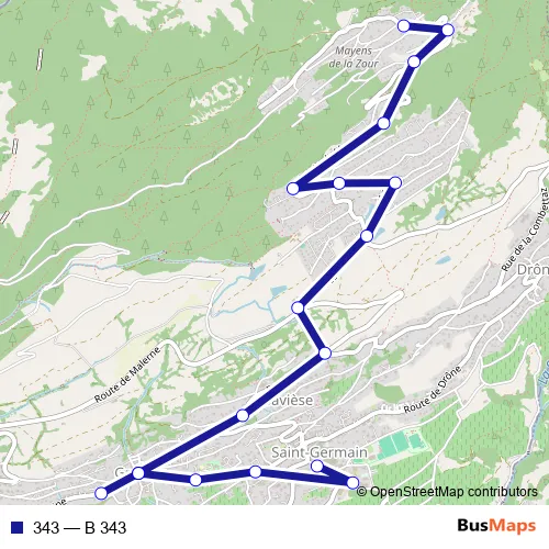The first stop of the 343 bus route is Savièse, Mayens-de-la-Zour and the last stop is Savièse, St-Germain centre. 343 (B 343) is operational during an Werktagen.