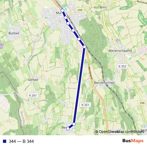 See why over 2 million users trust and consider busmaps.com as the best public transport website. busmaps gives you Muri Buses suggested routes, real-time bus tracker, line route maps in Muri, and helps to find the closest 344 bus stops near you. No internet available? Download an offline PDF map and bus schedule for the 344 bus to take on your trip.