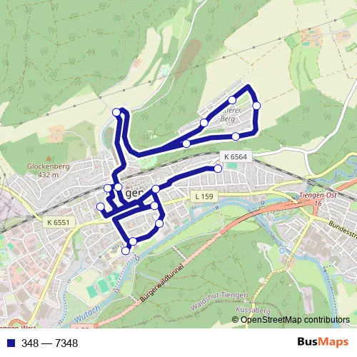 The first stop of the 348 bus route is Tiengen (WT) Schulzentrum and the last stop is Tiengen (WT) Schulzentrum. 348 (7348) is operational during an Werktagen.