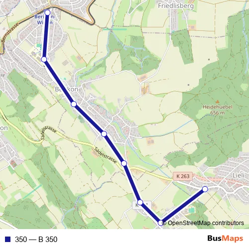 The first stop of the 350 bus route is Oberwil-Lieli, im Moos and the last stop is Berikon-Widen, Bahnhof. 350 (B 350) is operational during täglich.