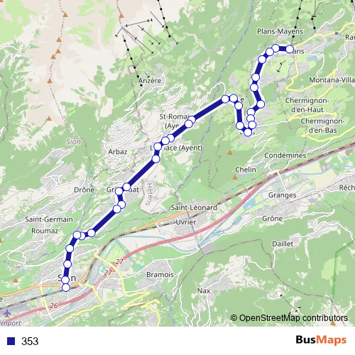 The first stop of the 353 bus route is Crans-Montana, Le Mèrignou and the last stop is Sion, poste/gare. 353 is operational during täglich.