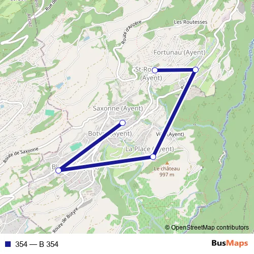 The first stop of the 354 bus route is Botyre(Ayent), centre scolaire and the last stop is St-Romain (Ayent), centre. 354 (B 354) is operational during täglich.