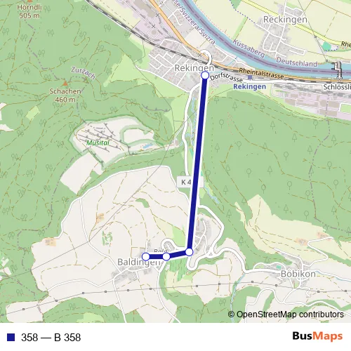 The first stop of the 358 bus route is Baldingen, Oberdorf and the last stop is Rekingen AG, Dorf. 358 (B 358) is operational during an Werktagen.