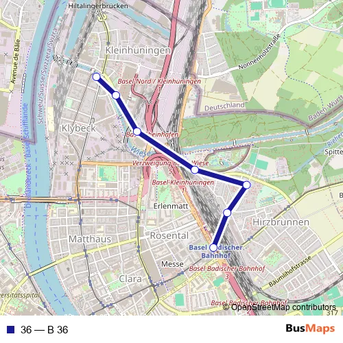 The first stop of the 36 bus route is Basel, Kleinhüningen and the last stop is Basel, Badischer Bahnhof. 36 (B 36) is operational during täglich.