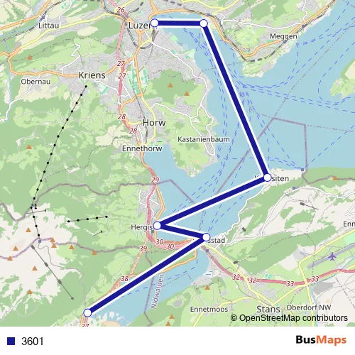 The first stop of the 3601 ferry route is Alpnachstad (See) and the last stop is Luzern Bahnhofquai. 3601 is operational during täglich.