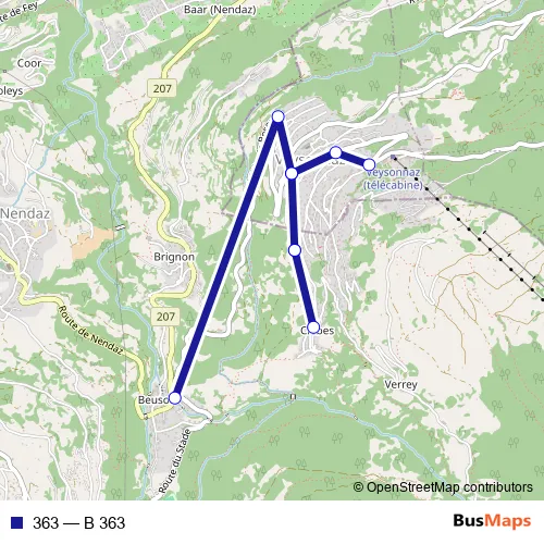 The first stop of the 363 bus route is Beuson (Nendaz), bif.Veysonnaz and the last stop is Veysonnaz, station. 363 (B 363) is operational during an Werktagen.