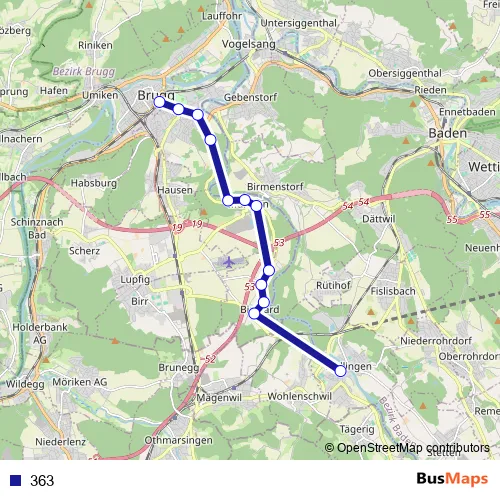 The first stop of the 363 bus route is Brugg AG, Bahnhof/Campus and the last stop is Mellingen, Lindenplatz. 363 is operational during täglich.
