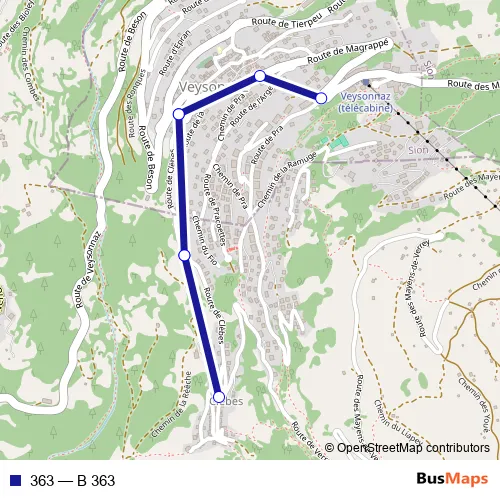 The first stop of the 363 bus route is Veysonnaz, bif. Clèbes and the last stop is Veysonnaz, station. 363 (B 363) is operational during an Werktagen.