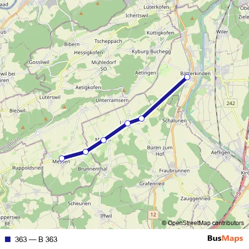 The first stop of the 363 bus route is Messen, Dorfplatz and the last stop is Bätterkinden, Bahnhof. 363 (B 363) is operational during an Werktagen.