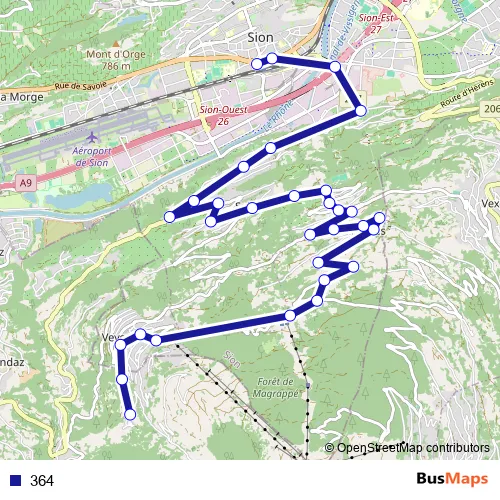 The first stop of the 364 bus route is Veysonnaz, bif. Clèbes and the last stop is Sion, poste/gare. 364 is operational during täglich.