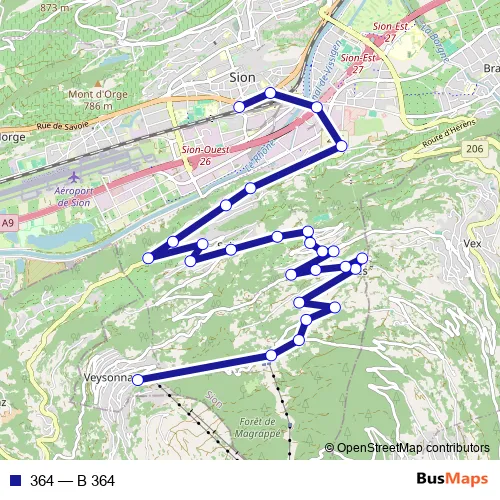 The first stop of the 364 bus route is Veysonnaz, station and the last stop is Sion, poste/gare. 364 (B 364) is operational during täglich.