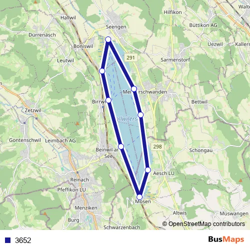 The first stop of the 3652 ferry route is Meisterschwanden Delphin and the last stop is Meisterschwanden Delphin. 3652 is operational during am Wochenende.