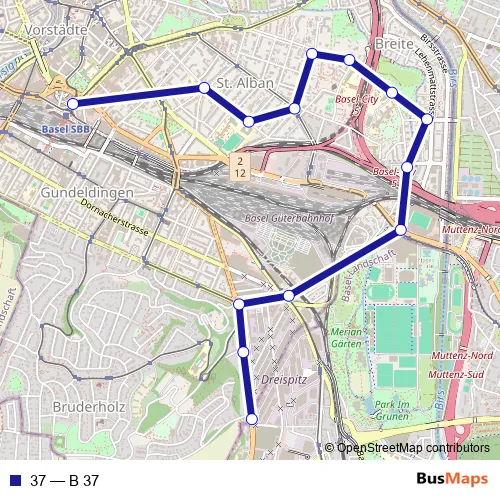 See why over 2 million users trust and consider busmaps.com as the best public transport website. busmaps gives you Basel Buses suggested routes, real-time bus tracker, line route maps in Basel, and helps to find the closest 37 bus stops near you. No internet available? Download an offline PDF map and bus schedule for the 37 bus to take on your trip.