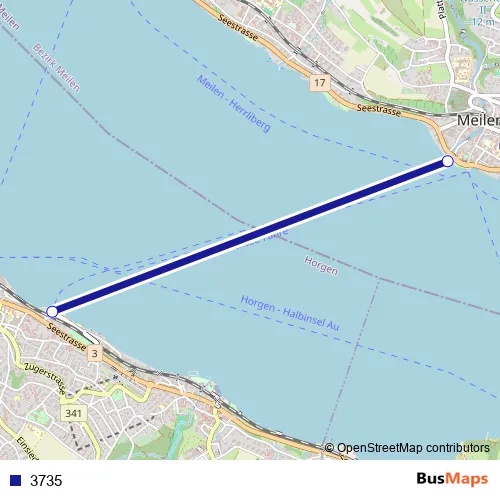 The first stop of the 3735 ferry route is Meilen Autoquai and the last stop is Horgen Autoquai. 3735 is operational during täglich.