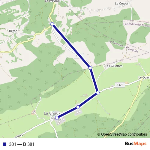 The first stop of the 381 bus route is La Chaux-du-Milieu, village and the last stop is Le Prévoux, La Soldanelle. 381 (B 381) is operational during an Werktagen.
