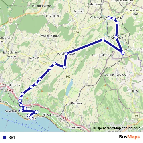 The first stop of the 381 bus route is Palézieux, gare and the last stop is Cully, gare. 381 is operational during täglich.