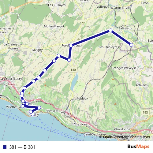 The first stop of the 381 bus route is Cully, gare and the last stop is Palézieux, gare. 381 (B 381) is operational during an Werktagen.