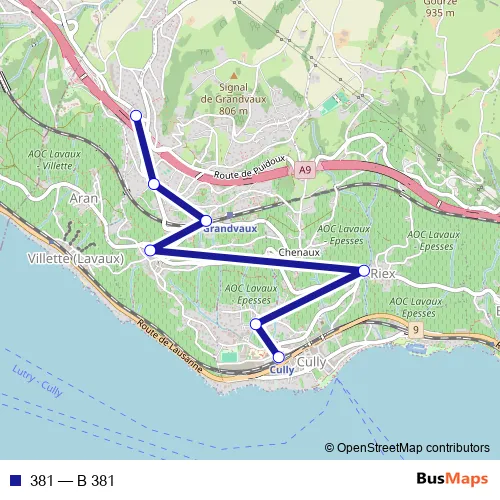 The first stop of the 381 bus route is Grandvaux, Pra Grana and the last stop is Cully, gare. 381 (B 381) is operational during an Werktagen.